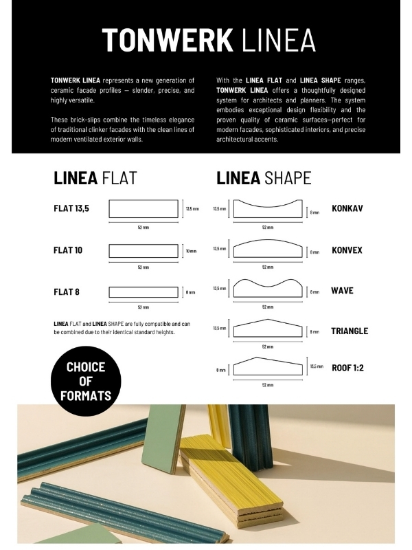 TONWERK-KLINKER sets new standards in design freedom and service for architects, planners, and property owners with the LINEA series. This innovative product line combines technical precision, exceptional flexibility, and a wide range of shapes, formats, heights, and glazes – offering virtually unlimited possibilities for designing modern facades and interiors.